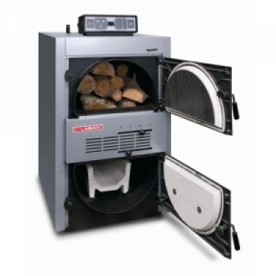– Caldera de acero para sólidos (troncos de leña) de llama invertida o gasificación, por combustión pirolítica. Su diseño y gran superficie de intercambio térmico permite, en combinación con la gestión electrónica que modula constantemente la velocidad del extractor de humos, conseguir rendimientos del 90%.